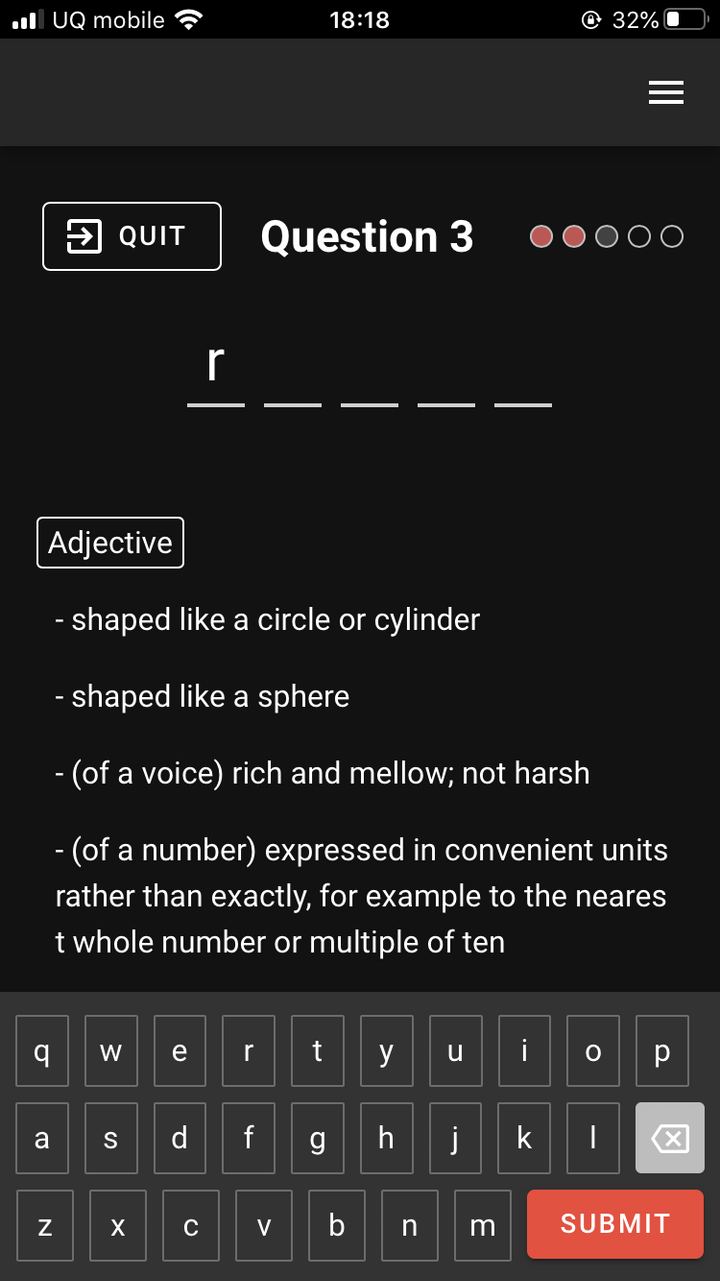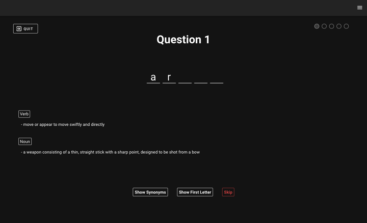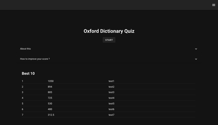 英単語の定義が英語で出題されるのでその単語を答えるゲームです。 スコアが算出されるのでランキングで競う事ができます。 構成はNuxt.js × Go × MySQL 問題はOxford Dictionaries APIを使って単語を取得してDBへ保存しています。 フロントはvercel、バックエンドはherokuでホスティングしています。 スマホではPWAにも対応しています。