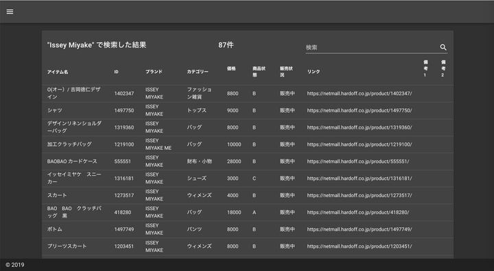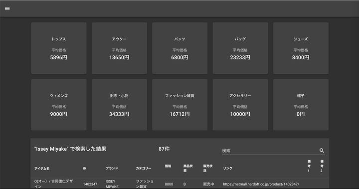 開発スキル: Nuxt.js , Python , AWS(Lambda, DynamoDB, API Gateway, CloudWatch) 制作期間: 1週間 Lambda,とDynamoDBによるサーバレスアーキテクチャです。 Pythonのライブラリ(beautiful soup4)でオンライン古着サイトをスクレイピングし、集まったデータをブランドごとに分類、平均価格を算出してDBに書き込みます。 Pythonでのデータの集計はAWSのLambdaで処理しており、CloudWatchと連携することで定期実行しています。またDynamoDBのStreamトリガーを利用して、新しい商品が追加された時には、「同ブランド、同カテゴリーの平均価格と比べて割高か割安か」というデータを含めた通知をSlackに投げてくれます。