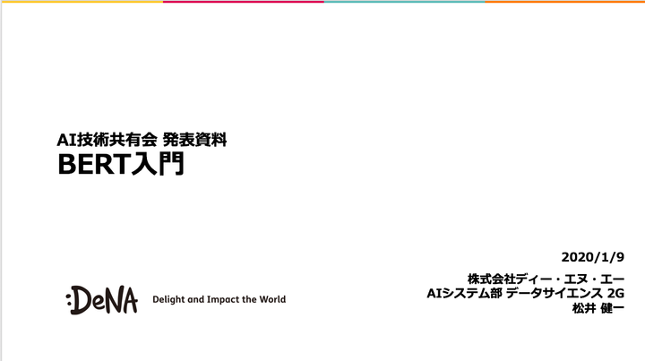 2020年1月の社内勉強会でBERTについて紹介した時のスライドです。BERTの工夫ポイント、Pre-trainingの方法、Transfermersライブラリの実装からモデルの構造を可視化などを紹介しています。