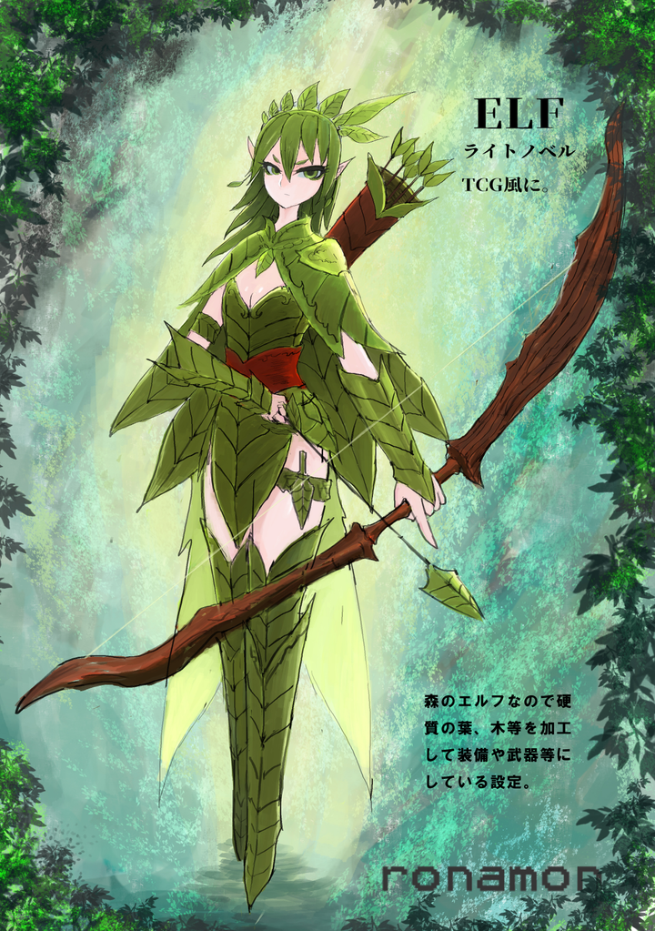 オーソドックスなエルフ。 葉っぱを特殊加工した衣装という設定。 TCGっぽい絵の練習。