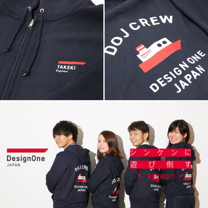 会社を船、社員を船員(CREW)と見立て コーポレートロゴのモチーフマークを活かし船のイラストをあしらったパーカーを製作 胸にはロゴを名札に変えたいという要望のもとデザイン。