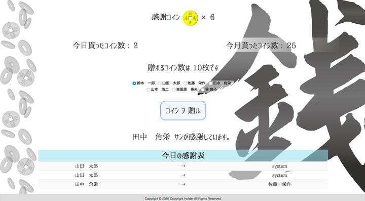 株式会社鈴木商店の経営課題である「社員のモチベーション向上と業務効率化」を実現するための業務支援サイト「鳶システム」を企画提案、制作を行っている。 ※主な担当業務:HTML/CSS設計、サイトデザイン、企画立案・プレゼンテーション、チーム制作のディレクションなど。 **機能/特徴** ①『感謝コイン』 「感謝の気持ち」をカタチにする機能。業務中に感じた"ありがとう"の気持ちを贈り合える。コインを貯めてガチャを回せば素敵な褒美(プライズ)をGETできる。 ②超集中モード 人が集中できる時間は"90分"。その90分にフォーカスして、全社員一斉に仕事に没頭する為の機能。カウントダウン中の視覚効果、終了後のねぎらい/感謝コイン連動など、楽しく集中できる工夫も取り入れている。