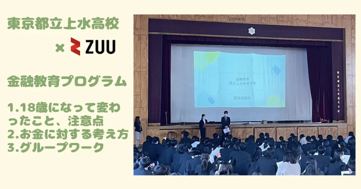 ZUUが定めるESG/SDGs方針の一つに金融教育があることから、金融×ICTを活用した『金融教育体験プログラム』の出張授業を行いました。 講師は相談者役とアドバイザー役という立場に分かれ、対談形式で「18歳になって変わることと注意点」についてデジタルコンテンツなども用いて生徒に寄り添った授業を実施しました。 お金に対する興味関心レベルを問わず、誰もが将来に向けてお金に対する正しい知識を学び、計画的に考え行動することの大切さを伝えました。また、グループワークではiPadを用いながら、ニュースや景気動向を調べ、5社の企業をサンプルに分析を行いました。
