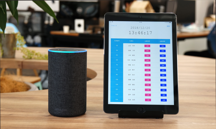 Just Check Inは勤怠管理をタブレット端末で操作するアプリケーションです。 Amazon Echoバージョンでは、音声からの指示でも同じように操作できることを実現しました。