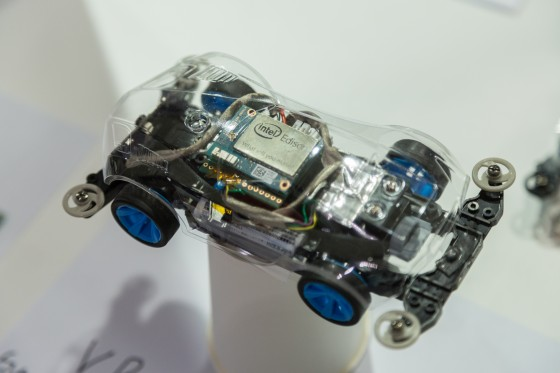 VRミニ四駆。ミニ四駆にネットワークカメラとコントローラーを搭載。操縦者はVRを装着してハンドル・アクセルを設置したドライビングシートに座ることで、あたかもミニ四駆に乗って運転しているようかのシミュレーション体験ができるシステム。