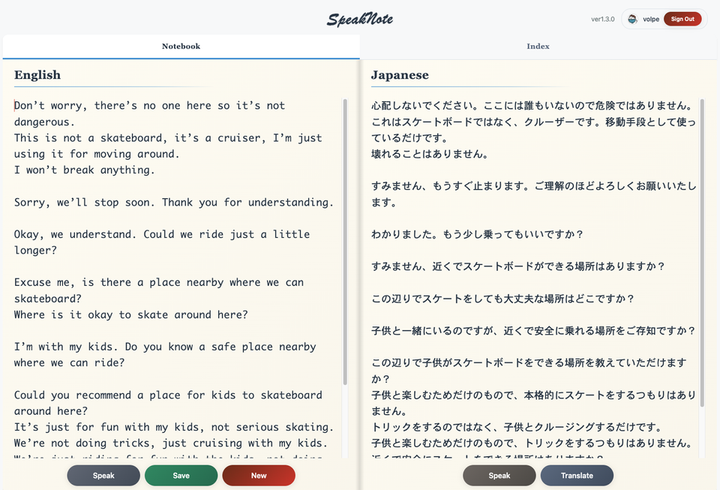英語学習用の喋るノート。 英文を打ち込むとリアルタイムで発音と自動翻訳する。 Claude Code によるバイブコーディングにて開発。