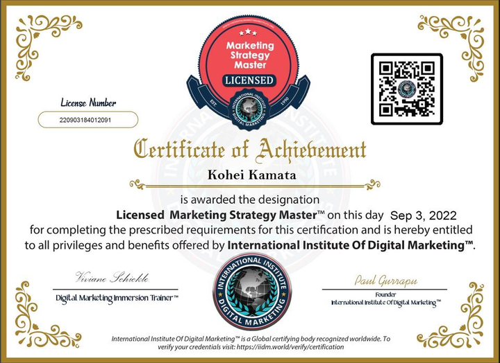 International Institute Of Digital Marketing™にてMareting Strategy™を取得。