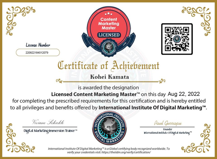 International Institute Of Digital Marketing™にてContent Marketing Master™を取得。