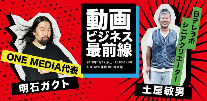 (肩書等は当時)「動画2.0 VISUAL STORYTELLING」を出版されたONE MEDIA代表の明石ガクトさんと、日本テレビ放送網日テレラボシニアクリエイターである土屋敏男さんをお迎えして、「動画ビジネス最前線〜ONE MEDIA代表明石ガクト×日テレラボシニアクリエーター土屋敏男〜」をKOTOWA 鎌倉 鶴ヶ岡会館で開催