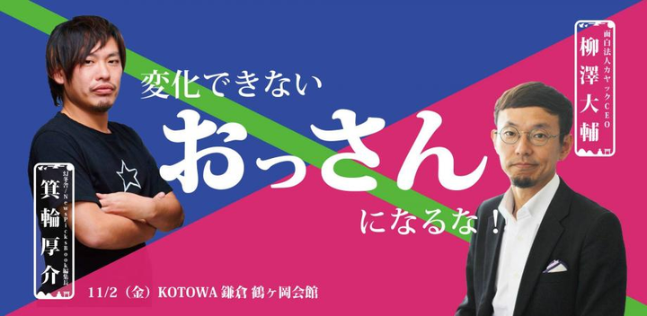 (肩書等は当時)幻冬舎/NewsPicks Book編集長 箕輪厚介さんと鎌倉唯一の上場企業である面白法人カヤックの代表取締役CEO 柳澤大輔さんをお迎えして、11/2(金)に「変化できない”おっさん”になるな!」〜幻冬舎/NewsPicks Book編集長 箕輪厚介×面白法人カヤックCEO 柳澤大輔トークショー〜をKOTOWA 鎌倉 鶴ヶ岡会館で開催