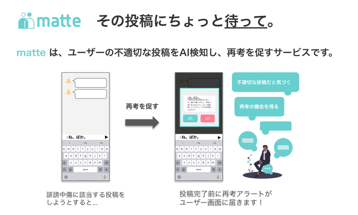 ◆役割 プロダクトマネージャー ◆概要:matte は、ユーザーの不適切な投稿をAI検知し、再考を促すサービスです。ユーザーに再考の”機会”と”気づき”を与えることにより誹謗中傷などのネットトラブル防止と、ユーザーにとって心地よいコミュニティの運営を支援いたします。