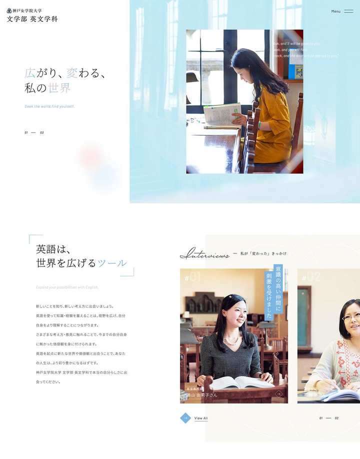 神戸女学院大学 文学部 英文学科様のWebサイトを制作いたしました。 「広がり、変わる、私の世界」をコンセプトに、新たな学びや価値観と出会うことで、広がる未来への可能性や期待感をデザインやコンテンツで表現しました。神戸女学院大学様の歴史と伝統ある世界観は崩さず、でも古くなりすぎないようにアップデート。英文学科で学ぶことで身に付く能力や知識、考え方をより端的に分かりやすく、まとめました。 ギャラリーサイト MUUUUU.ORG掲載:https://muuuuu.org/