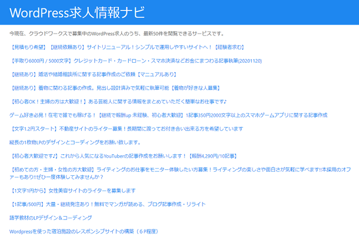 仕事を探す際に、直接求人サイトをチェックにしにいくのが手間だなと感じていたため、スクレイピングの練習も兼ねて簡単に求人情報をチェックできるものを作りました。 使用言語:PHP FW・ライブラリ:利用なし 開発に使った環境:PHPのビルトインサーバーを利用。 制作にかかった期間:3日前後