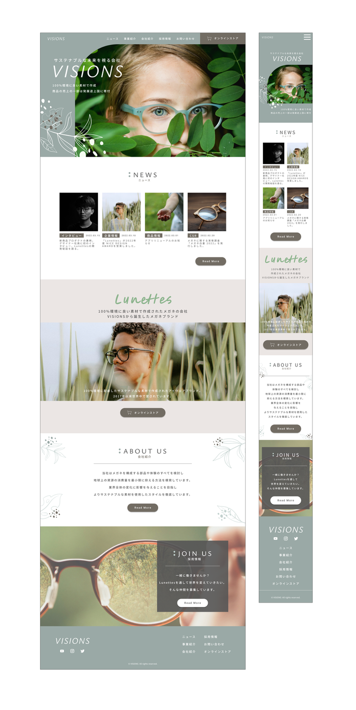 ⚠️自主制作の架空ホームページです。 メガネブランド「Lunettes(ルネット)」をオンラインで展開してる「株式会社Visions」は、環境に配慮した素材だったり、売上の一部を寄付したりと、SDGsに関心がある20~30代の若者中心に人気のブランドです。 ▼ターゲット -SDGs、サステナビリティー、社会貢献、ソーシャルグッド等に興味関心がある人たち。 -20代~30代の若年層がメインターゲットだが、老若男女どの世代でも購入してほしい。 -おしゃれでデザイン性もあるため、ファッションの一部としてLunettesのメガネを取り入れる人も増えている。 ▼目的 -Lunettesが最近話題になりつつあるものの、運営元のコーポレートページが存在しないため、企業メッセージや会社のニュースが届けられない。「どんな会社が運営してるのだろう?」と興味をもった人に情報を届けるサイトにしたい。また事業拡大に伴いメンバーの採用にも使いたい。 ▼ポイント -コンセプトである「サステナブル」を全体的に意識した、優しいグリーンカラー・少し細めのフォント選定 -またタイトル見出しにはメガネをイメージした⚫⚫︎などを︎つけて会社のプロダクトも意識 -あまり派手になりすぎず控えめで、余白をたっぷり使って見やすく制作