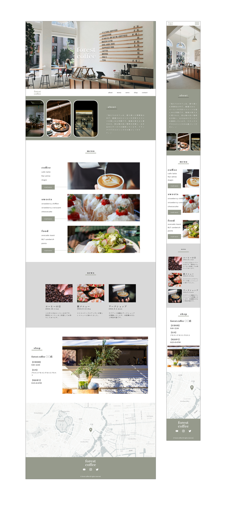 ⚠️自主制作のホームページです。 ▼ターゲット -カフェやランチが好きな20代〜40代の男女 ▼目的 -カフェオープンに伴うサイト制作 -カフェのメニューや問い合わせ先、MAPがわかるようなシンプルなHP ▼ポイント -お店のコンセプトカラーであるオリーブカラーを選定。 -上品さを感じるフォント -メニューがすぐわかるようなシンプルな内容