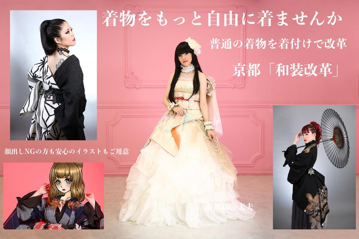 【和装改革】では、眠ったままの振袖や留袖などの着物を使い、大変身する撮影を行なっています。切ったり縫ったりせずにドレスのように着付けたりすることも可能です。 成人式や婚礼のお支度をしているスタッフが一般的お着付けと、あなたにあった個性的なお着付けをいたします。 変身したお姿のイメージイラスト付き。顔出しNGの方はお顔を隠して写真を使うことも出来るイラストをご用意いたします。
