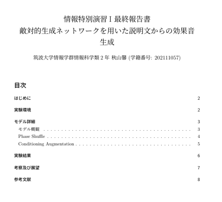 情報科学類における,情報特別演習という特定の教員にアドバイスをもらいながら自分の好きなものを開発する講義において,テキストから効果音を生成するGANのモデルを開発.実装に当たっては,CGANをベースとしつつ,Phase Shuffleと呼ばれる音生成を行うGANに用いられる生成物を安定させる手法や,Conditioning Augmentationと呼ばれる画像生成を行うGANに用いられる頑強化技術を取り入れた.