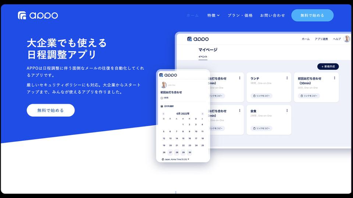 日程調整サービス「Appo」(https://appo.page)のプロジェクトリーダーとして、アーキテクチャ設計から開発全体を統括。特にフロントエンド開発においては、UI/UX設計から実装まで中心的な役割を担い、プロダクトの立ち上げからローンチまでを成功に導きました。