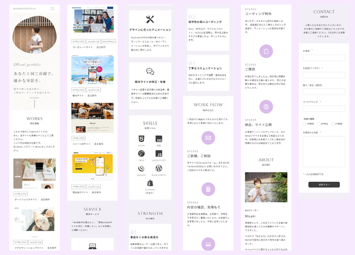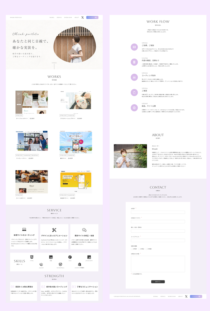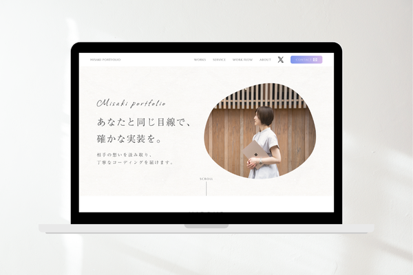 Misakiさんの強みである相手目線で考えて行動する優しく丁寧なところが伝わるよう、配色、フォント、余白にこだわりました。シンプルでわかりやすい構成でまとめ、ご本人の写真を載せることで「この人にお仕事を任せたい」と思ってもらえるような信頼感を意識しました。歴史スポット巡りが趣味ということだったので話のきっかけになるような江戸時代の街並みが残る風景で撮影しました。それに合わせてFVに和紙の背景を使い、写真が馴染みより優しい印象になっています。