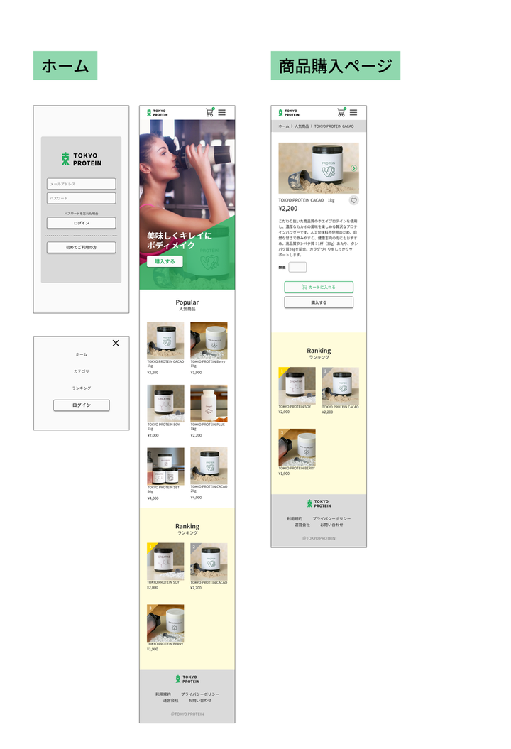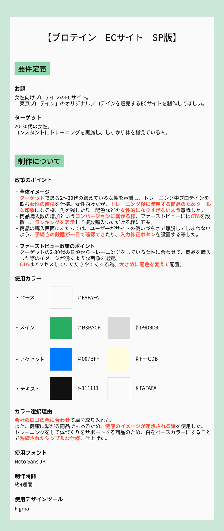 【概要】 女性向けプロテインのECサイトです。 サイトに訪れたユーザーに商品を購入頂くことを目的としています。 【使用ツール】 Figma 【工夫した点】 ・ターゲットである2~30代の鍛えている女性を意識し、トレーニング中プロテインを飲む 女性の画像を仕様。女性向けだが、トレーニング後に使用する商品のためクール な印象になる様、角を残したり、配色などを女性的になりすぎないよう意識した。 ・商品購入数の増加というコンバージョンに繋がる様、ファーストビューにはCTAを設置 し、ランキングを表示して複数購入いただける様に工夫。 ・商品の購入画面にあたっては、ユーザーがサイトの使いづらさで離脱してしまわないよ う、手続きの段階が一目で確認できたり、入力修正ボタンを設置する等した。