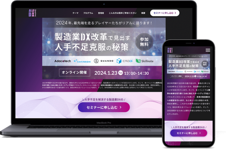 株式会社Quando様(セミナー集客用LP)です。ヒアリング・ライティング・デザイン・構築(STUDIO)まで一貫して担当しました。