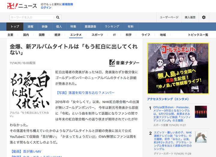 ゴールデンボンバー特設サイト『卍!ニュース:もう紅白に出してくれない』を作成しました。 鬼龍院翔さんのご依頼でYahoo!ニュースに酷似したデザインですが、ソースのコピーなどはせずイチから制作しております。レスポンシブデザインになっており、スマートフォンで見るとデザインが変わります。 広告バナー画像などもすべて弊社で制作しております。 TwitterなどのSNSでも反響をいただき、非常に楽しい制作でした☺ ※現在サイトは公開終了いたしました