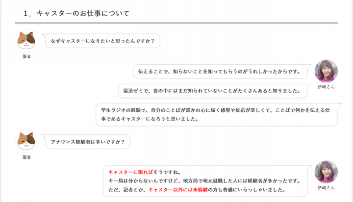 鹿児島大学から公共放送に就職した先輩にインタビュー。 スマホ閲覧ユーザーを念頭に置いた。 LINEのようなトーク形式を用い、ポップで見やすい記事を心がけた。