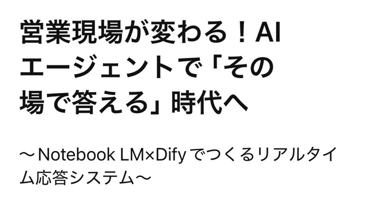 営業現場が変わる!AIエージェントで「その場で答える」時代へ ~Notebook LM×Difyでつくるリアルタイム応答システム~ こんにちは、小林です。 最近話題になっている営業AIエージェント「アポドリ」の動画を見て、「これは営業だけじゃなく現場サポート全般に広がる!」と感じました。 これまでのAIは「検索して答えを出してくれる便利ツール」でしたが、これからは 現場で隣に座ってリアルタイムで助けてくれるパートナー になるんです。今回はその仕組みを、Notebook LMとDifyを使った具体的な開発イメージも交えてお話しします。 ⸻ なぜ今「現場サポートAI」なのか? 営業や現場対応で一番困るのは、 • 「この質問、どう答えればいいんだろう?」 • 「情報は持っているけどすぐ出せない!」 といった場面ですよね。 そこでAIエージェント。 顧客との会話をその場で文字起こし → 適切な回答を即提案 → 営業担当は確認して返答。 つまり「横で一緒に商談に参加してくれる賢いアシスタント」が手に入るわけです。 ⸻ 仕組みをざっくり言うと… 1. 音声入力 → 顧客の質問や要望をリアルタイムでキャッチ 2. Notebook LM → 会話の文脈を理解して候補の返答を生成 3. Dify → 返答パターンやトーンをテンプレート化して運用 4. 出力 → 営業担当の画面にテキスト表示(場合によっては音声返答も可) これで、「少し考えさせてください…」という間をグッと減らせるんです。 ⸻ Notebook LMとDifyをどう使う? • Notebook LM → 複雑な会話の流れを把握し、FAQや過去の提案資料から最適な答えを引き出す。 • Dify → 営業担当が「柔らかめ」「ビジネスライク」といった返答トーンを簡単に切り替えられる。 開発者視点では、Difyでプロンプトを外部化できるので 非エンジニアでも運用・改善が可能。これがかなり大きいポイントです。 ⸻ どんな場面で役立つ? • 営業現場 → 技術的な質問への即時回答 • コールセンター → 対応のばらつきをなくす • 建設・医療・製造業の現場 → マニュアルをその場で引き出すサポート つまり「応答のスピードと質」が命の現場には、どこでもフィットします。 ⸻ 開発ステップのイメージ 1. 現場の会話を洗い出す(よくある質問リスト化) 2. 人+AIのハイブリッド運用(まずは補助的に活用) 3. Difyで返答パターンを整備(運用メンバーが調整できる状態に) 4. 完全自動化へ拡張(最終的にはAIに任せる部分を増やす) 段階を踏んでいけば、現場に自然にAIが溶け込むイメージです。 ⸻ 実際の効果は? • 応答までの「間」が短縮される • 担当者の心理的負担が減る • 顧客満足度が上がる • 商談成功率もアップ 要するに「人が得意なコミュニケーション」に集中できる環境をつくれるんです。 ⸻ まとめ → 営業や現場対応の未来 これからのAIは「調べる道具」から「一緒に戦う相棒」へシフトしていきます。 Notebook LMとDifyを組み合わせれば、現場でのやり取りをAIが即サポートする世界がすぐそこに。 質問をその場で解決 → 顧客との距離が縮まる → 成果が出る。 これが、AIエージェント時代の新しい現場のカタチだと思います。 ⸻ この仕組みを「営業だけでなく医療・介護・建設」など人手不足の業界にも広げられると確信しています。