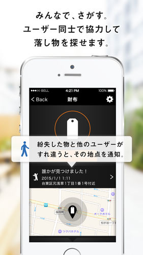 BLEビーコンを用いた落し物防止タグです。 24時間常にタグに紐付いた貴重品が手元から離れないか見守りを行い、また、紛失したタグの近くを他のユーザーが通過すると持ち主に発見場所を通知します。