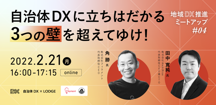 ヤフーLODGEが主催企画する【自治体DX×LODGE】の1つ、「地域DX推進ミートアップ(シリーズ)」について 現在、全国の自治体によるDXの取り組みは、地域特性、地域課題によってさまざまで、推進レベルも異なります。自治体及び地域企業が抱える課題に対し、実例を持つソリューション企業のデジタル技術や課題解決サービスの事例・活用等を知っていただき、産業課題解決を検討するきっかけを提供したいと思います。自治体DX推進の新しい気づきやエッセンスを、みなさまと共に学べる機会となることを目指します。 シリーズで開催している本企画・運営・司会進行を担当しています。 第4回を、2022年2月21日 16:00-に行いますので、PeatixのURLより概要をご確認いただき、興味ある方はぜひ視聴のお申し込みをお願いします。 また、過去3回の「地域DX推進ミートアップ #01〜#03」についても、アーカイブ動画を残していますので、こちらも参照ください。 https://www.youtube.com/playlist?list=PLv5lRk3Bg0vQlaeVViQaaPT6ueIH95U6-