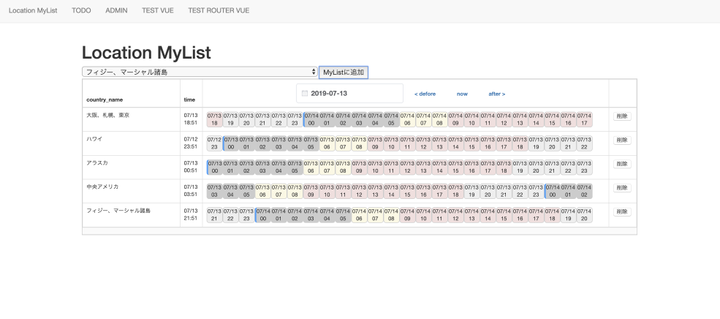 場所を自由に登録しておける世界時計です。 Vue.jsの学習用に作成したので公開前提の作り込みはしていません。 技術要素はVue.js, Laravel, PostgreSQL, heroku