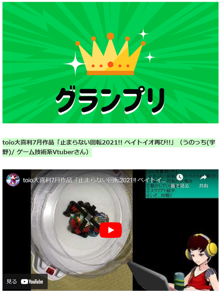 toio大喜利7月作品「止まらない回転2021!! ベイトイオ再び!!」(うのっち(宇野)/ ゲーム技術系Vtuberさん) レオトイさんからコメントをありがたく頂戴しました。