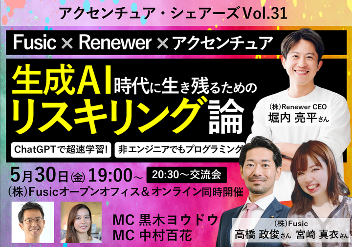 【アクセンチュア・シェアーズ】Vol.31『生成AI時代に生き残るためのリスキリング論』5/30(金) 19:00 - 20:30に企画から関わり、ゲストアサインから登壇までおこなう。