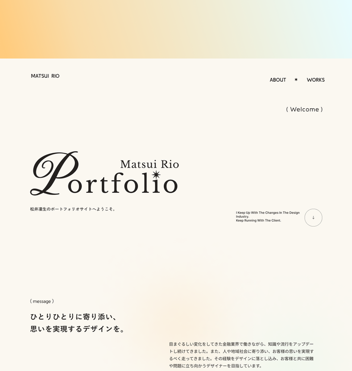 就活用のポートフォリオ作成しました。スクールと独学で学んだことを活かして、今の自分の実績とスキルを記載しています。また、採用担当の方が求めている内容がすぐわかるような構成に。 url : https:// matsuirio-portfolio .studio.site
