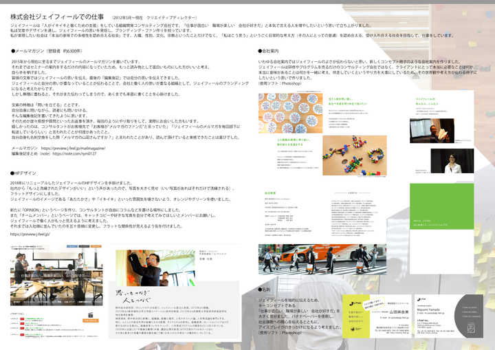 ●メールマガジン(登録者 約6300件) 2015年から現在に至るまでジェイフィールのメールマガジンを書いています。 冒頭の文章ではジェイフィールの思いを伝え、最後の「編集後記」では自分の思いを伝えてきました。 ジェイフィールと自分の思いが重なっていることが伝わることで、会社と働く人の思いが重なる組織として、ジェイフィールのブランディングになると考えたからです。 しかし無理に重ねると、それがまた伝わってしまうので、あくまでも率直に書くことを心掛けました。 度々感想や質問といったお返事を頂き、毎回のようにやり取りをして、実際にお会いした方もいます。 嬉しかったのは、コンサルタントが客先に訪問した際「今日訪問したお客様が”メルマガのファンだ”と言っていた」「ジェイフィールのメルマガを毎回部下に転送しているらしい」と言われたなど反響があったこと。 自分自身も名刺交換をした際「メルマガの山田さんですか?」と言われたことがあり、読んで頂けていると実感できたことは喜びでした。 メールマガジン https://preview.j-feel.jp/mailmagazine/ 編集後記まとめ(note)https://note.com/rym0127 ●HPデザイン 2018年にリニューアルしたジェイフィールのHPデザインを手掛けました。 ジェイフィールのイメージである「あたたかさ」や「イキイキ」といった雰囲気を壊さないよう、オレンジやグリーンを使いました。 新たに「OPINION」というページを作り、コンサルタントが自由にコラムなどを書ける場所にしました。 また「チームメンバー」というページでは、キャッチコピーや好きな写真を自分で考えてみてほしいとメンバーにお願いし、ジェイフィールで働く人がもっと見えるように考えました。それまでは入社順に並んでいたのを五十音順に変更し、フラットな関係性が見えるよう気を付けました。 (使用ソフト:Photoshop) ●会社案内 いわゆる会社案内ではジェイフィールのよさが伝わらないと思い、新しくコンセプト冊子のような会社案内を作りました。 ジェイフィールは研修やプログラムを売るだけのコンサルティング会社ではなく、クライアントにとって本当に必要なことは何かを一緒に考え、伴走していくというやり方を大事にしているため、その世界観や考え方が伝わる冊子にしたいという思いで作りました。 (使用ソフト:Photoshop) ●名刺 ジェイフィールを端的に伝えるため、キーコンセプトである「仕事が面白い 職場が楽しい 会社が好きだ」を大きく見せました。バナナペーパーを使用し、社会課題への関心を伝えるとともに、アイスブレイクのきっかけになるよう考えました。 (使用ソフト:Photoshop)