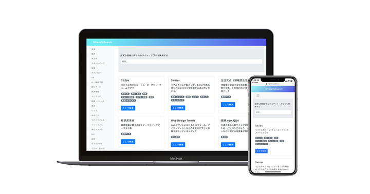 検索サイトの検索サイト、のように「カテゴリー名で検索するとその情報を検索するのにおすすめのサイトを教えてくれる」ようなサービス。Ruby On Rails で開発。現在もβ版として利用は可能だが開発は終了している。