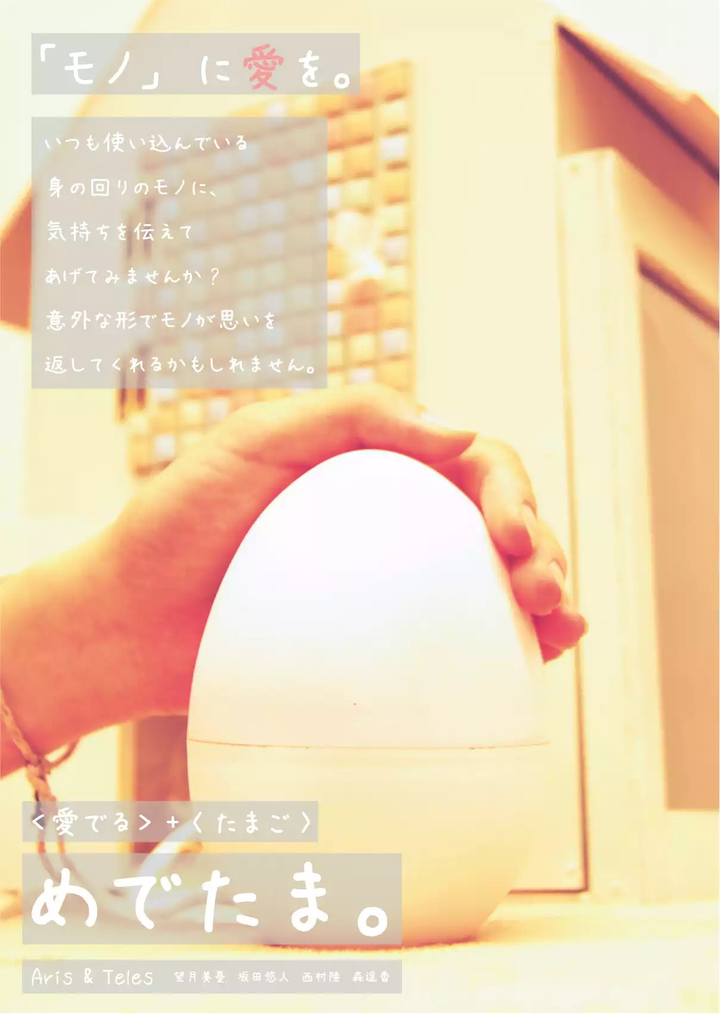 制作:チームAris&Teles(望月美憂,西村陸,坂田悠人,森遥香) アートアンドテクノロジー東北コンテスト2014 審査員特別賞 この作品のコンセプトは、「モノに愛を。」たまごを愛でるという動作によって普段使っている身近なモノに愛情を伝えようという作品である。たまごを愛でるとその愛情を受け取ったモノからの反応も見られるインタラクティブアート作品。