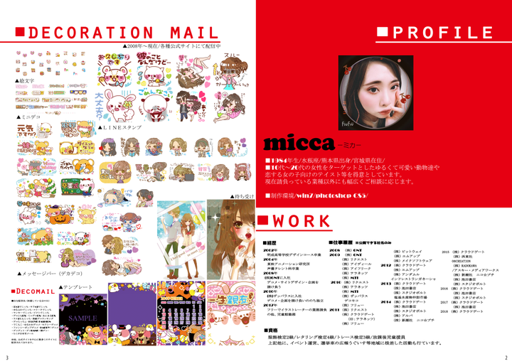 2008年からモバイルコンテンツ内にてデコメのデザイナーを経てフリーで活動開始しました。 その後お仕事の幅を広げ、児童書のカットイラストやニコ☆プチのイラスト等に寄稿。 イラストの他、児童館に勤めながら遊びや工作を通じて子ども達の成長に関わりながら放課後児童支援員と児童厚生員二級の資格を取得。