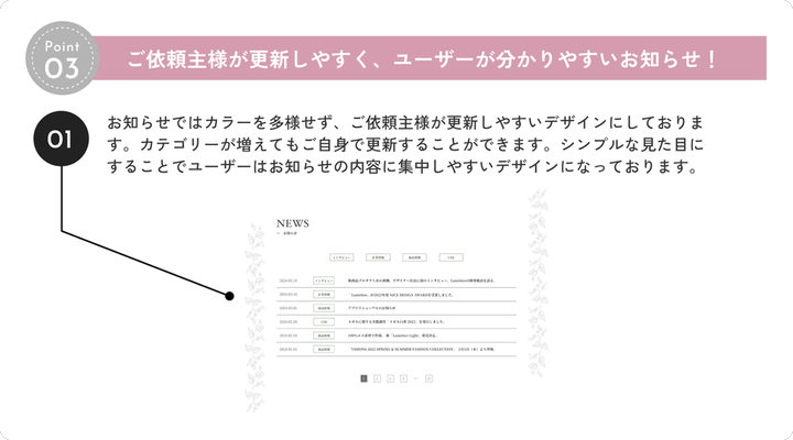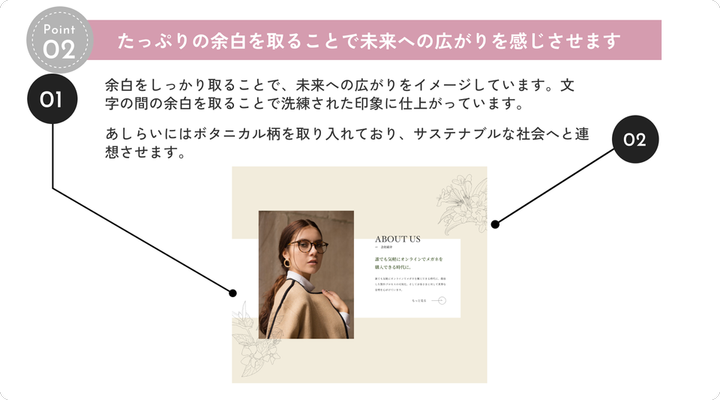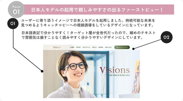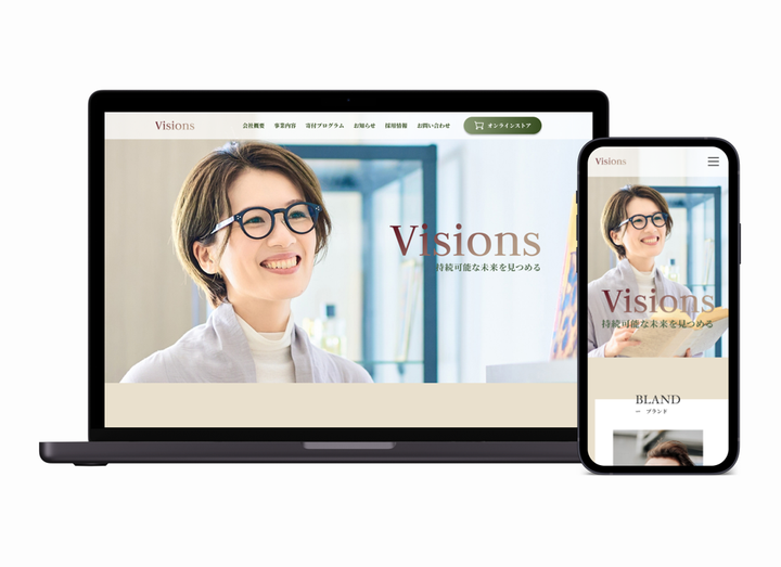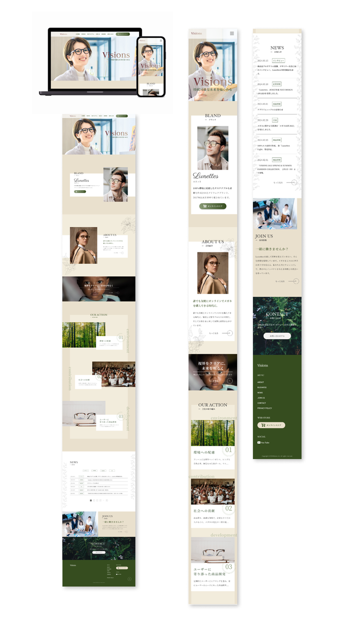 制作範囲:デザイン 使用ツール:Figma、Photoshop 制作期間:30日間 概要:メガネブランド「Lunettes」をオンラインで展開している「株式会社Visions」のコーポレートサイト 目的:サステナブルな社会実現を目的とした会社であることの認知、(企業理念に興味を持った)事業拡大メンバーの採用 制作の3つのポイント 1 日本人モデルの起用で親しみやすさの出るファーストビュー 2 たっぷりの余白を取ることで未来への広がりを感じさせます 3 ご依頼主様が更新しやすく、ユーザーにわかりやすいお知らせのセクション!