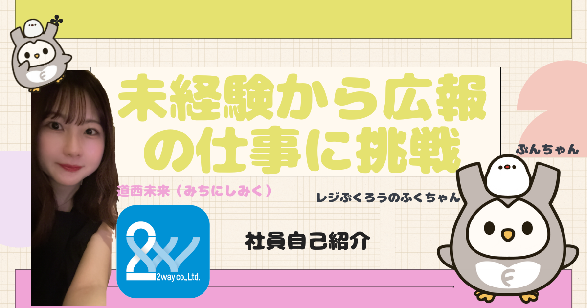はじめまして!道西未来と申します。 「人の心を動かすこと」に強く惹かれ、これまで営業・営業事務の経験を積んできました。 現在は株式会社2wayに未経験から広報のお仕事に挑戦中です!