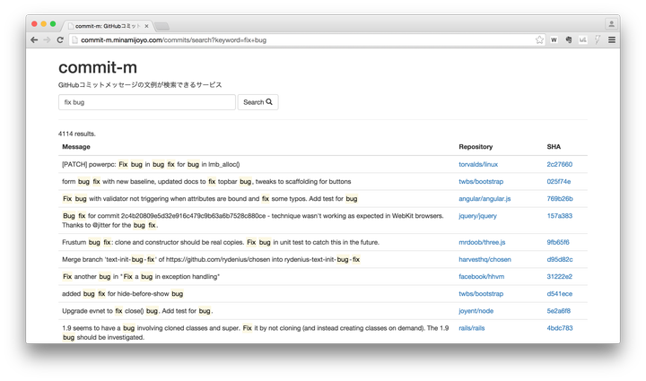 GitHubコミットメッセージの文例が検索できるサービス