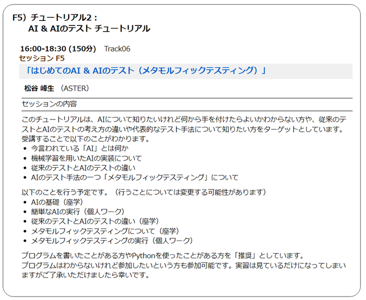 JaSST(ソフトウェアテストシンポジウム) Tokyoで、有料のAIチュートリアルを行いました。 AIの仕組みの説明と、AIプロダクトに対するテスト手法の話を行いました。