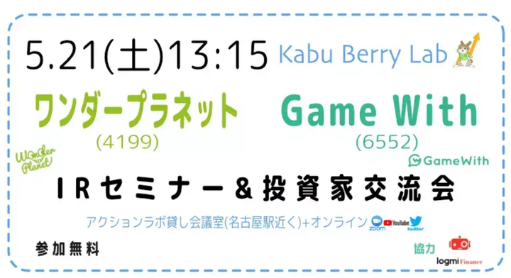 日時:2022年5月21日(土)13:15~ ・オフライン会場; 愛知県名古屋市中村区名駅南1丁目19-27 オルバースビルディング名古屋 ・オンライン; https://kabuberry.com/lab47/#yykk 参加費:無料 ワンダープラネット社(グロース・4199)と合同登壇のイベント。 名古屋市のおいて、個人投資家の方を中心とした投資家の皆様にGameWithの事業の魅力や成長性などをお話させていただきました。