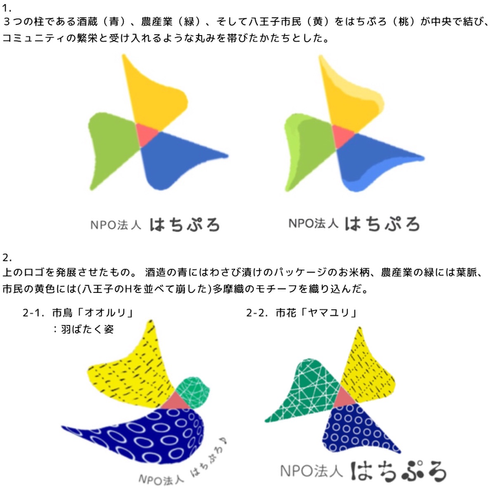 プロダクトデザイン研究室・課題・地域連携 酒造店である河内屋さんを中心とした、NPO法人はちぷろのブランディングロゴの制作課題兼地域連携プロジェクト。 酒造の見学から始まり、八王子市のイメージのブレスト、ネガティブなイメージをポジティブにに変えるような提案を目指した。 *ゼミとの産学連携だったが、 市の方が別のデザイナーの方を入れていたことがわかり、採用されず。 気持ちの良い進行の仕方や心のモチベーションも学ぶ。