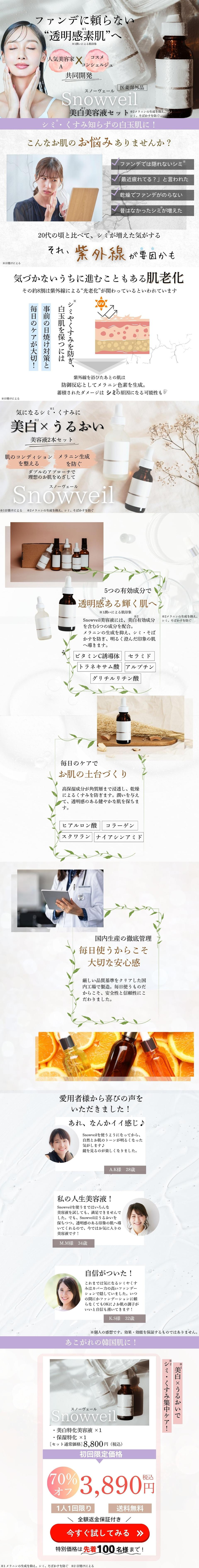 Webデザインも勉強中です。以下仮のペルソナを設定し、CanvaでLPサンプルを作成いたしました。 【ペルソナ設定】 ・アラサー女性会社員、オフィス勤務。平日は朝7時起床で出勤、夜は23時就寝。 ・頬・目の下のくすみが気になり、写真に写る自分にがっかりする。 ・20代の頃は日焼け止めを適当に塗っており、肌の透明感が衰えてきたと実感。 ・スキンケアは毎朝5分、夜はゆっくり保湿。色々な美容液を試すが効果はイマイチ。 ・美容にはお金をかけたいが、通う手間やコストがかかるクリニックより、手軽にホームケアで改善したい。 ・SNSや美容系ブログで口コミや成分情報をチェックするのが習慣。 【作成意図】 LP・セールスライティングの基本構成に沿って、 読者の悩みへの共感→商品説明(商品がおすすめの理由)→口コミによる安心感→CTA の流れで作成しました。 FVでは読者の悩みから逆算し、理想の未来をイメージできるコピーを意識しました。 CTAでは、限定性や緊急性を加えることで、”今購入すべき理由”を自然に提示しています。