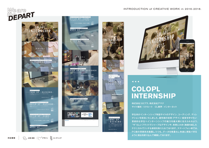 株式会社コロプラ、株式会社アマナ サイト種別:リクルート CL業界:インターネット 学生向けインターンシップ特設サイトのデザイン、コーディング、ディレクションを担当いたしました。最先端の技術・デザイン・経営を学びたい意欲的な学生へインターンシップの魅力を最大限に伝えられるよう、“今”らしいフラットでシャープなデザインや、背景に大きく動画を配したテクニカルでリッチな表現を取り入れております。スマートフォン版では、PC版の雰囲気を踏襲しつつも、データを軽量化し快適に閲覧できるように演出を絞り込んで構築しております。