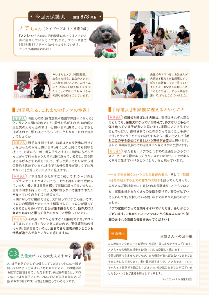 保護犬を引き取ってくださった里親さんに取材に行き、お話を伺って記事にしました。 デザインを決めるにあたって、「ペッツファーストらしいデザイン」をデザイナーさんに伝える必要があったので、色味やアイコンの使い方について細かく指示しました。