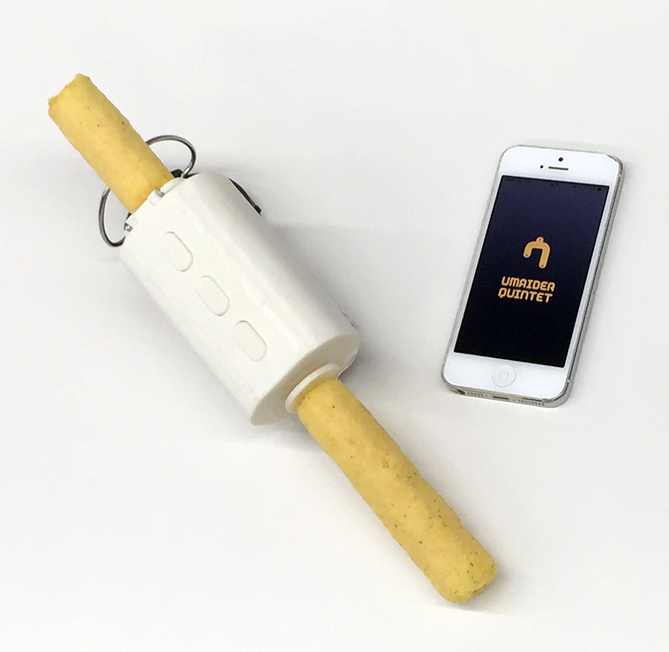 世界初!?「食べラブル」な楽器、うまいボーン 食べられる=「食べラブル」なデバイスを組み込んだ管楽器のようなプロダクト「UMAIBORN(ウマイボーン)」 うまい棒を、トロンボーンの様に伸ばしたり縮めたりすることで音色を操れ、演奏後には美味しく食べられる。 2本のうまい棒をしっかりホールドするのは、ウマイダーCoreと呼ばれる樹脂製本体。 3Dプリンタで出力された手に馴染む外形の中には、各種の伸び縮みセンサー、加速度センサー、うまい棒をかじることをセンシングするかじりトリガーを搭載。 筐体及び機構設計を担当。 Play-A-Thon 2014 で開発 Engadget Fes 2014 Windeで発表 https://vimeo.com/112849155?from=outro-local Microsoft GoAzure 2015「おばかIoT」登壇発表