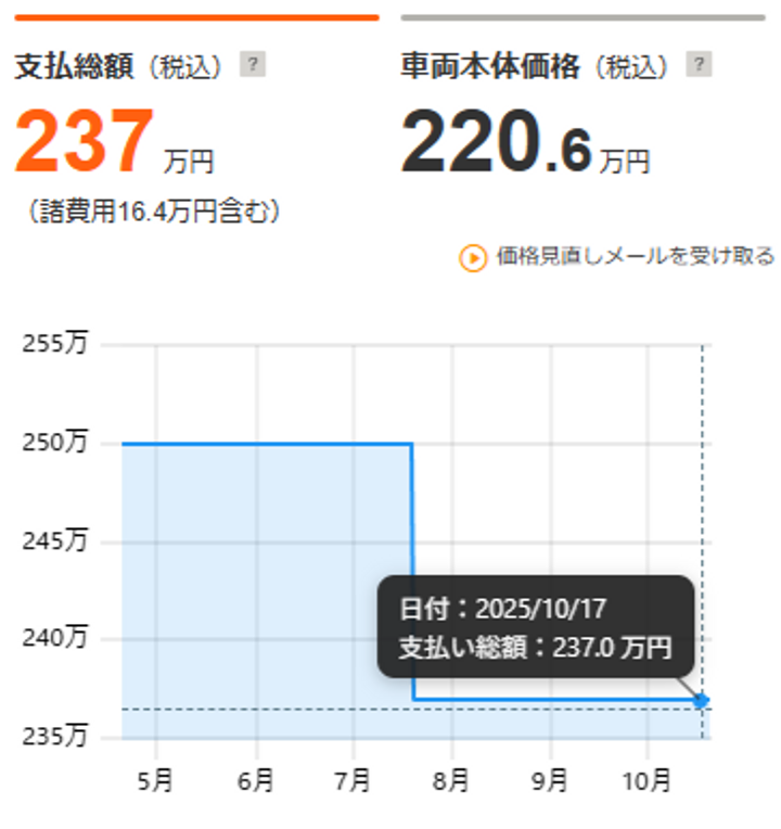 この拡張機能は、カーセンサーの車両ページに過去の価格推移グラフを追加します。 グラフで価格の動きを把握し、買い時の判断材料にしてみてください!
