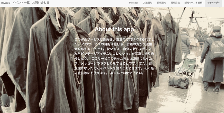 使用言語 Ruby, html, css, JavaScript ,jQuery, Ruby on rails, github, AWS, Linux github URL. https://github.com/koukimiura/VINFASH 古着好きの方々が交流できるwebサービスを作成しました。投稿、フォロー、通知、チャットなどの機能があります。 新しくfacebook, twitter認証入れました。